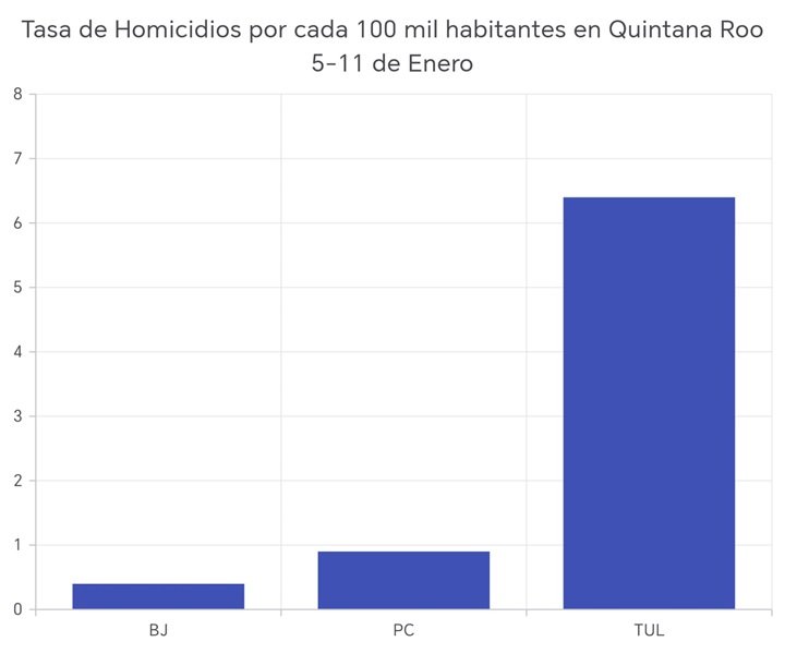 El análisis por tasa poblacional confirma que, aunque Benito Juárez concentró más eventos en números absolutos, Tulum fue el municipio con mayor nivel de violencia letal durante la semana pasada.