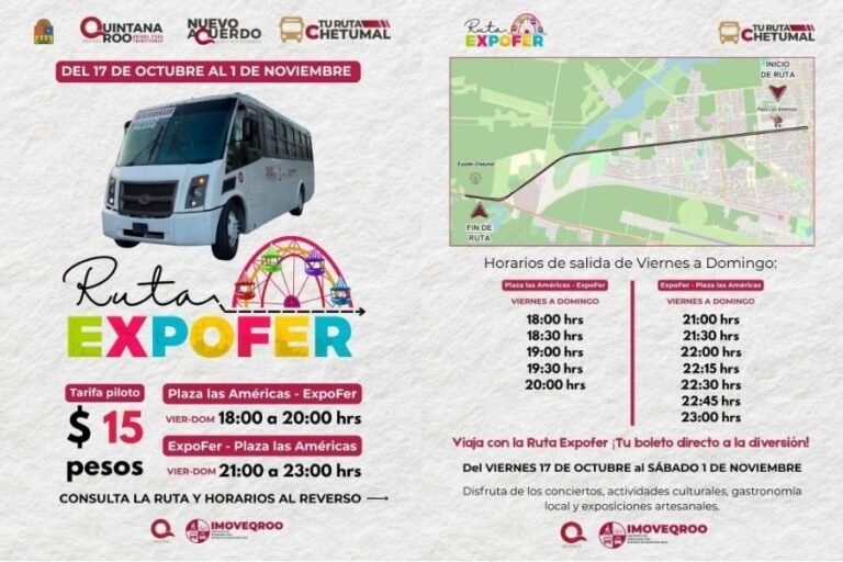 CHETUMAL.- El Instituto de Movilidad del Estado de Quintana Roo (Imoveqroo) activará mañana un servicio temporal de transporte público llamado “Expoferia Chetumal”, que conectará Plaza Las Américas con el Parque Quintana Roo; sede de la Feria de la Frontera Sur Expofer Chetumal 2025.