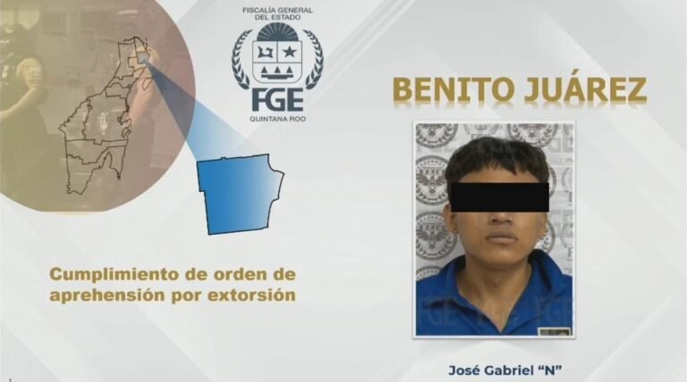 Cancún.– La Fiscalía General del Estado informó sobre la detención y vinculación a proceso de un joven identificado como José Gabriel “N”, de 21 años de edad, por su probable responsabilidad en el delito de extorsión en agravio del propietario de un establecimiento de comida ubicado en la Supermanzana 74 del municipio de Benito Juárez.