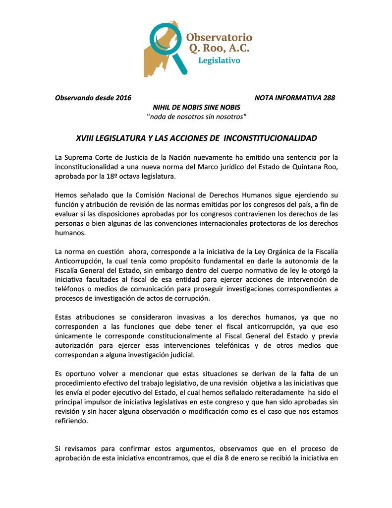 CHETUMAL.- El Observatorio Legislativo de Quintana Roo acusó al Congreso del Estado de falta de compromiso y revisión parlamentaria, lo que ha derivado en que al menos diez decretos y reformas aprobadas por la XVIII Legislatura enfrenten acciones de inconstitucionalidad ante la Suprema Corte de Justicia de la Nación (SCJN), la mayoría promovidas por Comisión Nacional de los Derechos Humanos (CNDH).