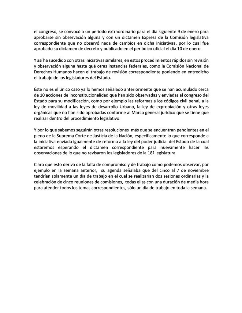 “Éste no es el único caso ya lo hemos señalado anteriormente que se han acumulado cerca de 10 acciones de inconstitucionalidad que han sido observadas y regresadas al Congreso del estado para su modificación”, subrayó.