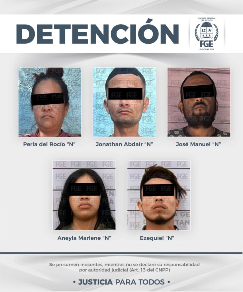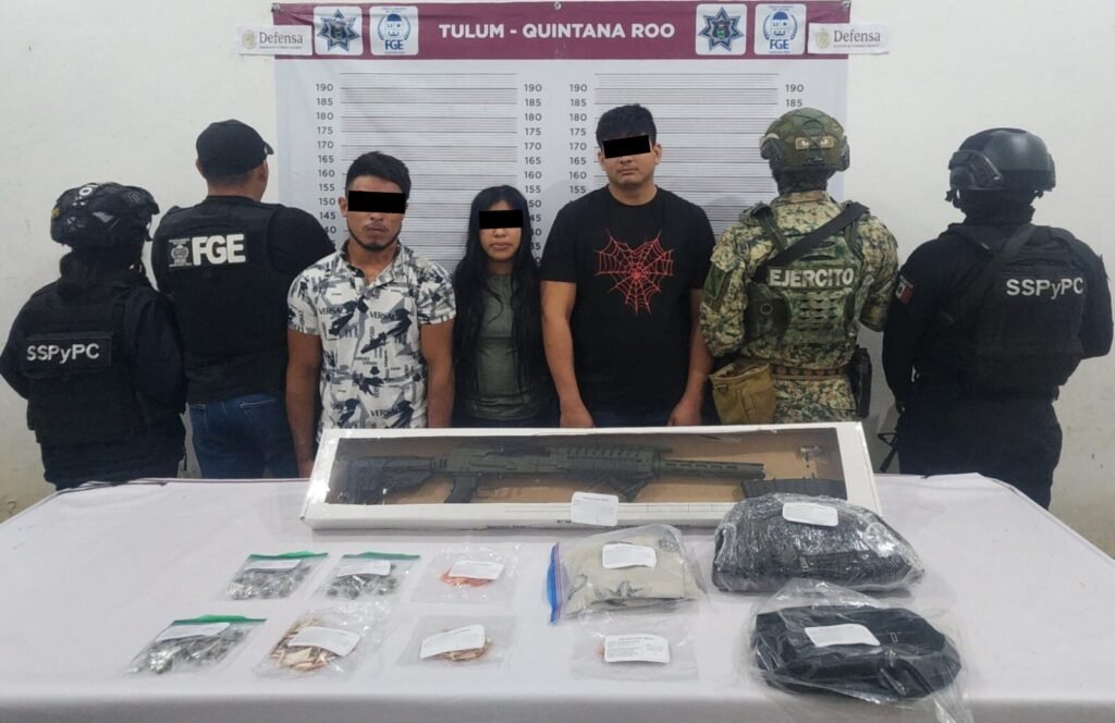 Muy cerca del domicilio cateado, los agentes detuvieron a Ezequiel “N”, Juan Carlos “N” y Aneyla Marlene “N”, a quienes les aseguraron un arma de fuego larga con un cartucho útil, vegetal verde y seco, así como material sintético con características similares a la cocaína. Cabe señalar que los detenidos son presuntos integrantes de un grupo criminal generador de violencia en el municipio de Tulum.