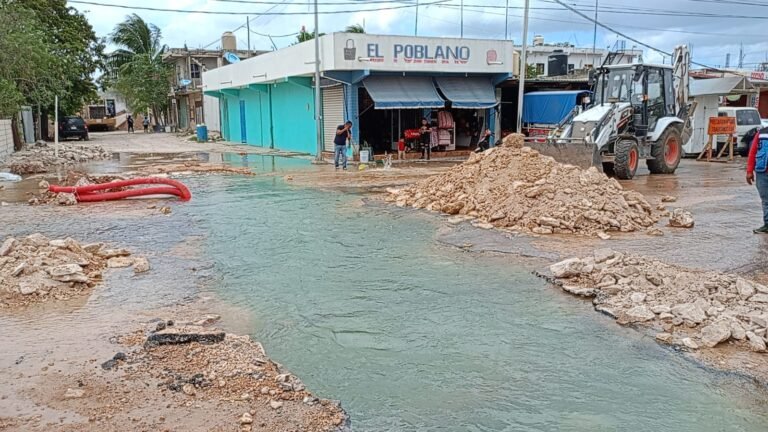 Playa del Carmen.‐ Cientos de litros de agua fueron desperdiciados la tarde de este martes, luego que una maquinaria de construcción rompiera una línea de suministro de la empresa Aguaban al norporniente de Playa del Carmen.