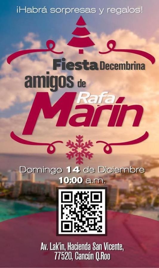 CANCÚN.– La agrupación denominada “amigos de Rafa Marín” realizará una fiesta decembrina el domingo 14 de diciembre, a las 10:00 horas, en Avenida Lak’in, Hacienda San Vicente, Cancún, de acuerdo con la invitación difundida entre simpatizantes.