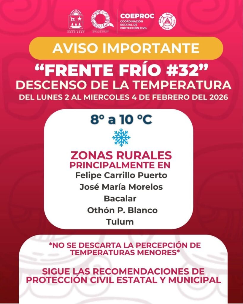 CANCÚN- El ambiente frío continuará en Quintana Roo durante los próximos días, con un descenso más marcado de la temperatura en municipios del sur y en comunidades rurales, donde los termómetros podrían ubicarse entre los 8 y 10 grados Celsius, principalmente durante la madrugada y el amanecer.