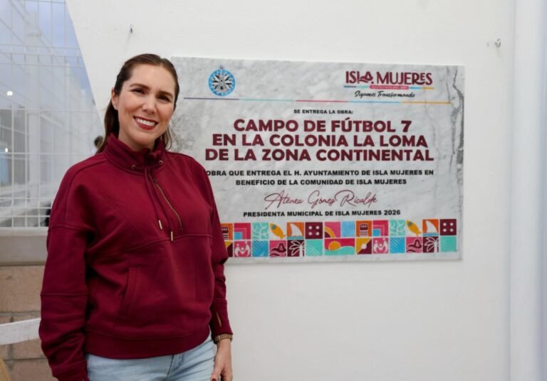 ISLA MUJERES.— Cumpliendo su compromiso de seguir transformando la Zona Continental, la Presidenta Municipal, Atenea Gómez Ricalde, inauguró la primera cancha de fútbol 7 en la colonia La Loma de Ciudad Mujeres, una obra histórica que fortalece la infraestructura deportiva en esta zona del municipio.