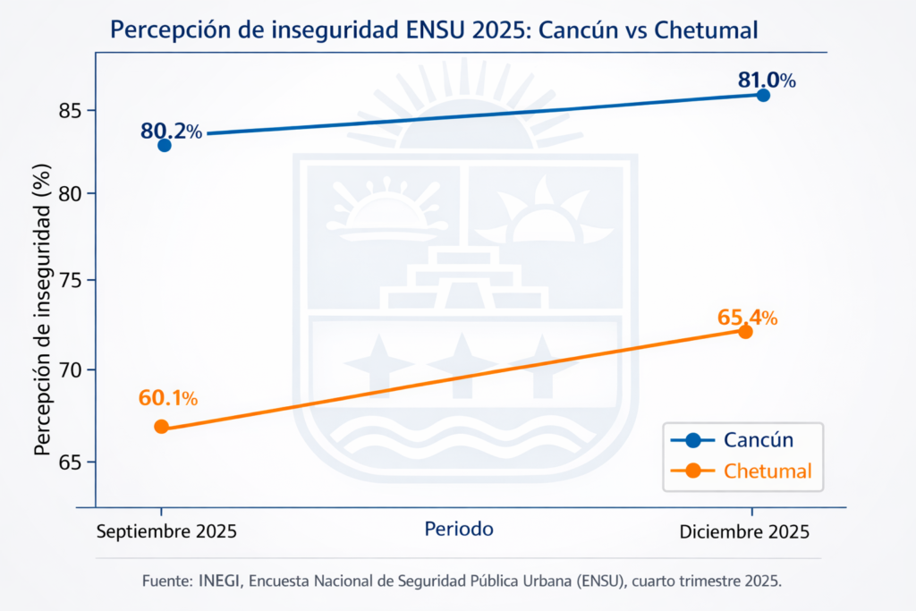 Los datos muestran que en Cancún la percepción de inseguridad pasó de 78.9% en septiembre a 81.0% en diciembre de 2025, mientras que en Chetumal el incremento fue más pronunciado, al subir de 58.5% a 65.4% en el mismo periodo.