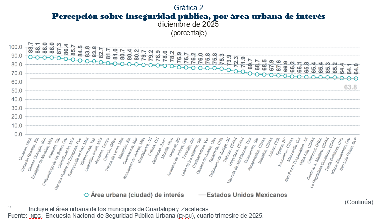 “En diciembre de 2025, 63.8% de la población de 18 años y más residente en áreas urbanas consideró que era inseguro vivir en su ciudad”, señala el propio INEGI en el informe nacional, elaborado a partir de una medición aplicada en 91 ciudades del país.
