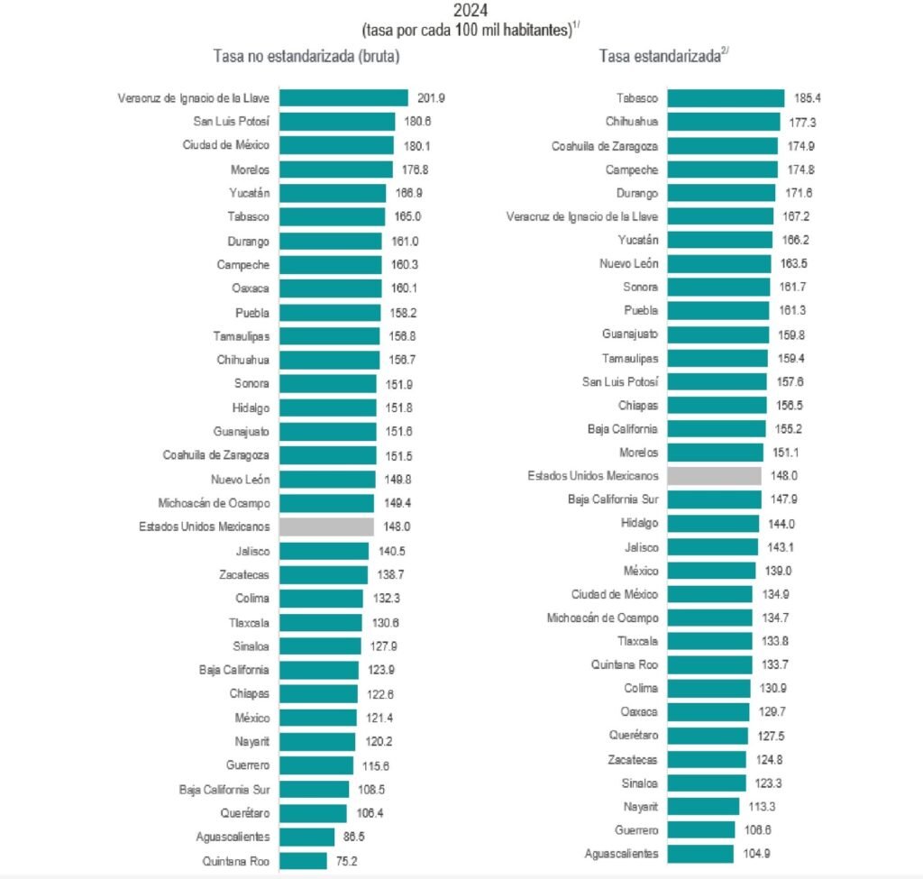 Las mayores tasas estandarizadas por cada 100 mil habitantes, según entidad federativa de residencia habitual, se presentaron en Tabasco con 185.4; Chihuahua con 177.3 y Coahuila, con 174.9. Las más bajas se presentaron en Aguascalientes, con 104.9; Guerrero, con 106.6 y Nayarit, con 113.3. En el resultado con la tasa no estandarizada (bruta), Veracruz tuvo la tasa más alta, con 201.9 y Quintana Roo la más baja, con 75.2.