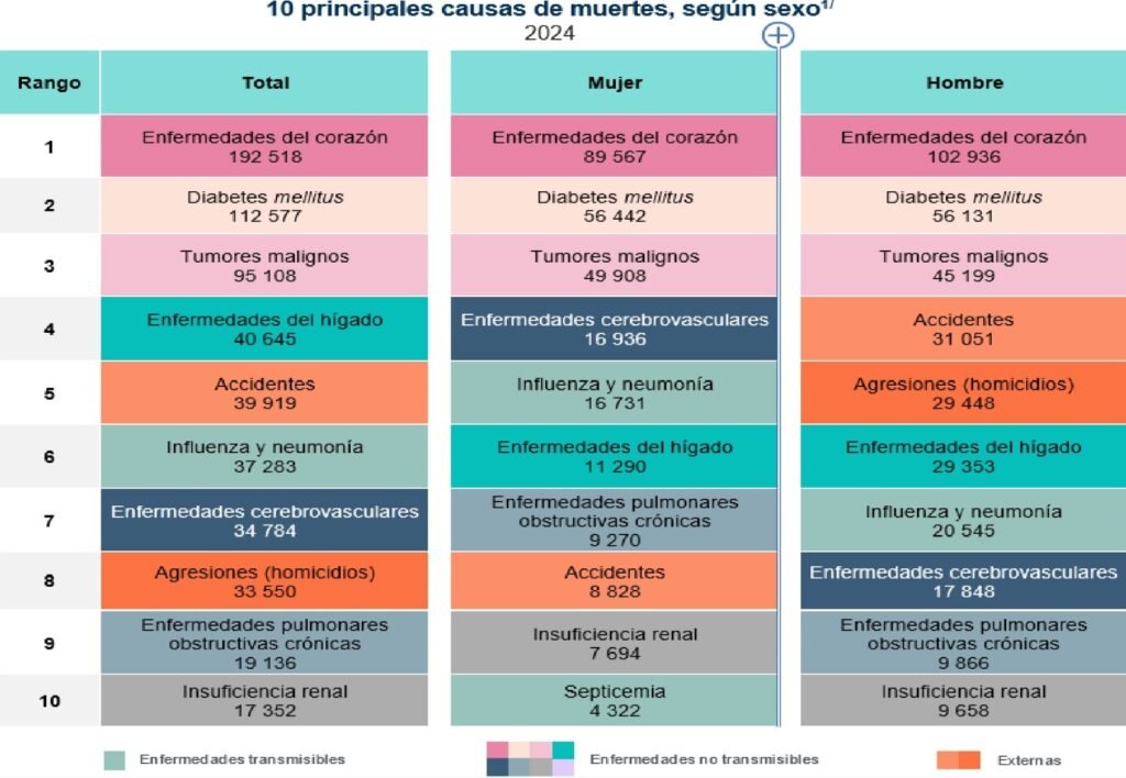 La dependencia agrega que las enfermedades del corazón, la diabetes mellitus y los tumores malignos fueron las tres primeras causas de defunción a nivel nacional, tanto para mujeres como para hombres. Las otras causas de muerte fueron enfermedades del hígado, las cerebrovasculares, accidentes, influenza y neumonía, agresiones (homicidios), enfermedades pulmonares obstructivas crónicas, insuficiencia renal y septicemia.