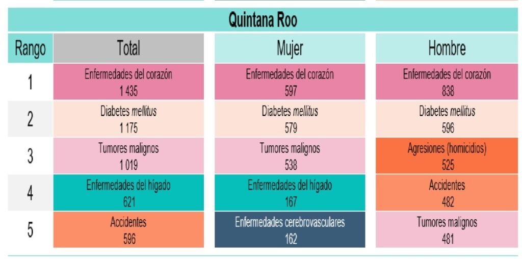 El Inegi informó que las cinco principales causas de muerte en Quintana Roo fueron: Enfermedades del corazón, 10 mil 4239; diabetes mellitus, 7 mil 065; tumores malignos, 4 mil 351; enfermedades del hígado, 2 mil 966 y las enfermedades cerebrovasculares fueron 2 mil 001.