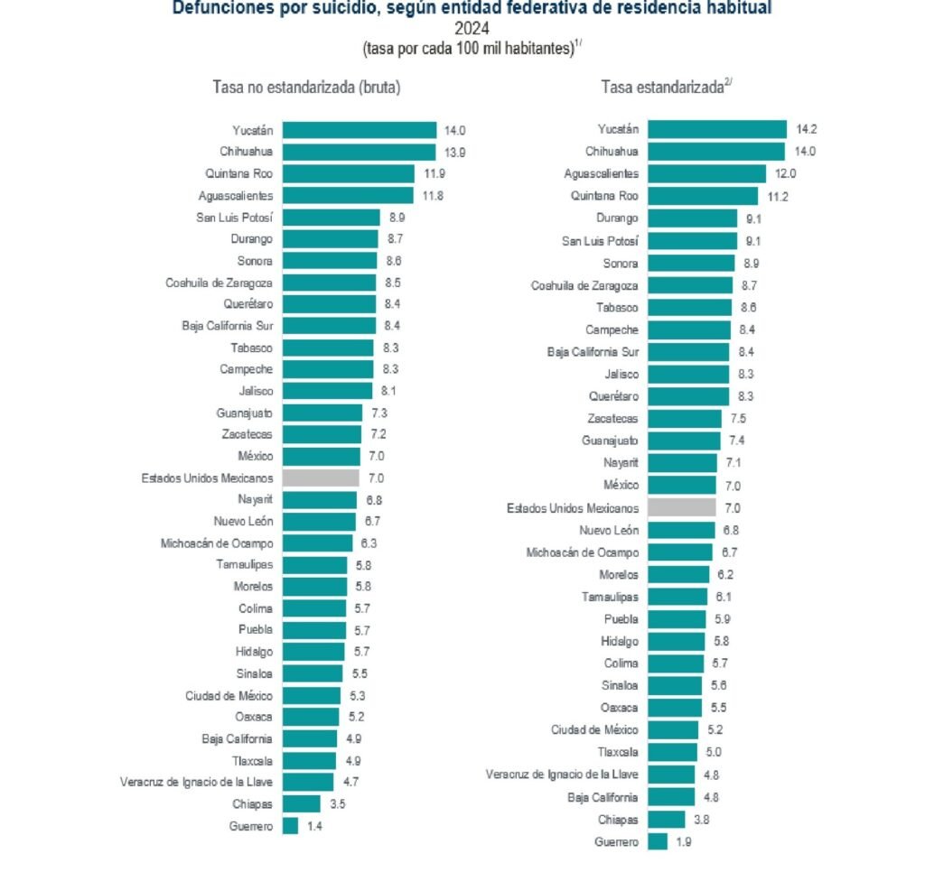 Las entidades federativas de residencia habitual con las mayores tasas estandarizadas de suicidio fueron Yucatán, con 14.2; Chihuahua, con 14.0 y Aguascalientes con 12.0. Las tasas más bajas correspondieron a Guerrero, con 1.9; Chiapas, con 3.8; Baja California y Veracruz con 4.8 cada una. Yucatán tuvo la tasa no estandarizada (bruta) más alta, con 14.0 y Guerrero la más baja, con 1.4 (ver gráfica 34). En los suicidios, tanto la tasa no estandarizada (o bruta) como la estandarizada por cada 100 mil habitantes presentaron magnitudes similares.