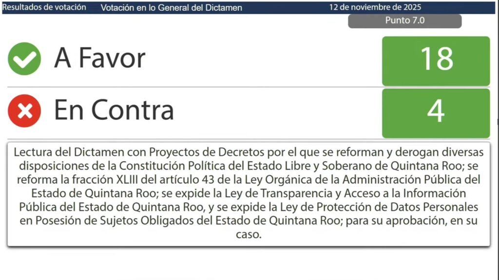 Finalmente por mayoría, el Congreso del Estado aprobó este martes reformas a la legislación local en materia de transparencia y protección de datos personales, que incluyen la desaparición del Iapqroo y la creación del Instituto Quintanarroense de Transparencia para el Pueblo como nuevo órgano garante dentro de la administración pública estatal.