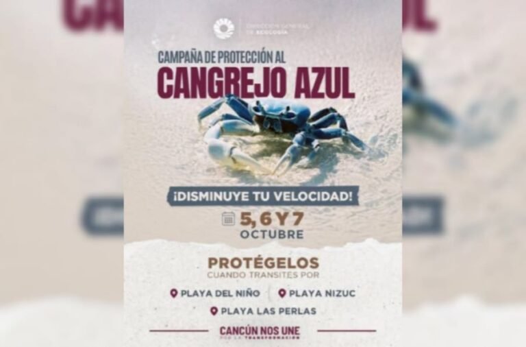 CANCÚN.- El Ayuntamiento de Benito Juárez, a través de la dirección de Ecología Municipal, invita a la ciudadanía a participar en la campaña de protección al cangrejo azul, que se realizará del 5 al 7 de octubre.