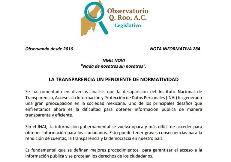 “Sigue sin cumplirse lo decretado en la reforma constitucional de la sesión del 6 de febrero de la XVII Legislatura y publicada el 11 de febrero 2025, en el Periódico Oficial del Estado sobre la Declaratoria 02, que reforma, adiciona y deroga diversas disposiciones de la Constitución Política estatal, lo que lleva a la extinción del Instituto de Acceso a la Información y Protección de Datos Personales de Quintana Roo (Idaipqrfoo)” expresa dicha observación.