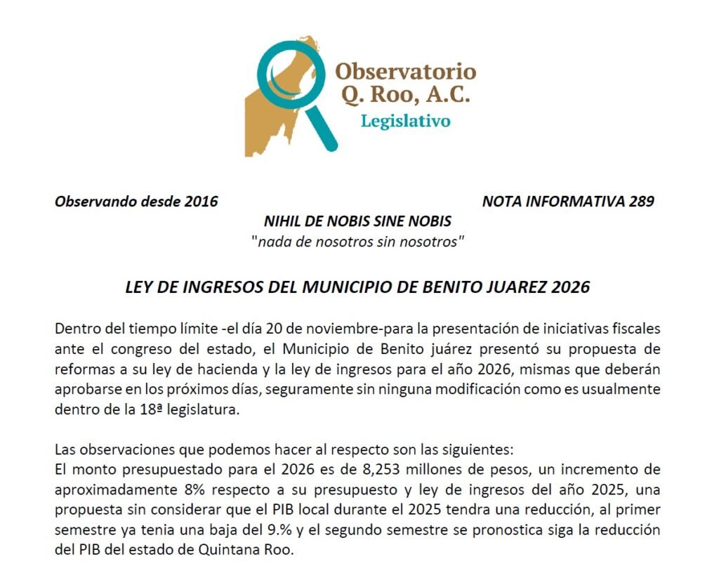 A tal conclusión ha llegado el Observatorio Legislativo de Quintana Ro en su boletín 289 que comenzó a circular este 25 de noviembre, al analizar el caso de Benito Juárez, en el rubro de los cambios e incrementos en el cobro de diversos derechos: