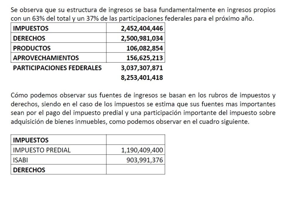 Esto es lo correspondiente a los ingresos estimados para el 2026; lo importante será para terminar el análisis correspondiente, verificar la propuesta del presupuesto de egresos para saber si continúa con la tendencia de utilizarlo mayormente en una orientación al gasto versus la obra pública que tanto se requiere en la ciudad.