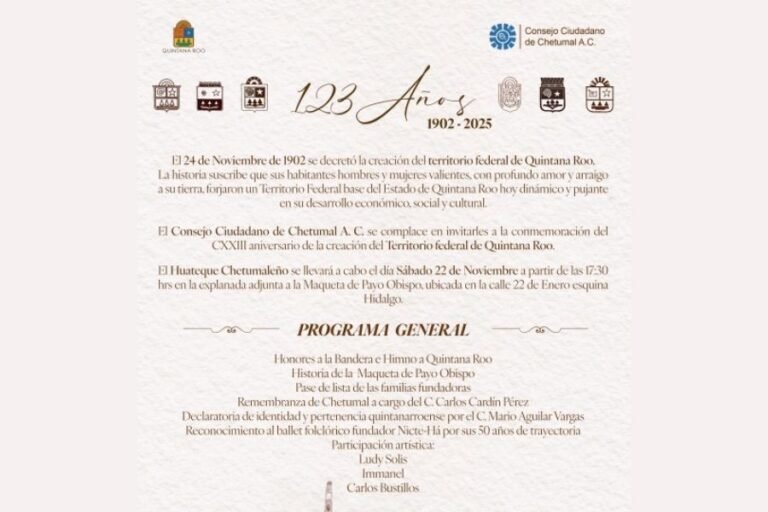 El Consejo Ciudadano de Chetumal celebrará el 123 aniversario de la creación del Territorio Federal de Quintana Roo con un tradicional “Huateque Chetumaleño” el próximo sábado 22 de noviembre en la plazoleta de la Maqueta de Payo Obispo, a partir de las cinco y media de la tarde.