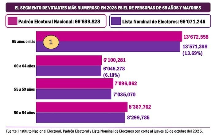 De una lista nominal de 99 millones de electores en 2025, las personas de 65 años y más llegaron a 13.5 millones, que representan el 13.6%. Mientras que las de 20-24 años son 11.1 millones con 11.2% de la lista nominal.