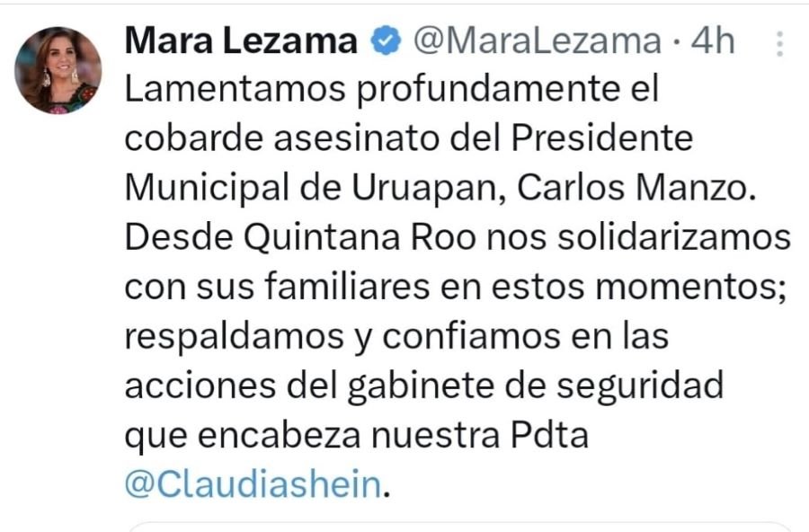 “Lamentamos profundamente el cobarde asesinato del presidente municipal de Uruapan, Carlos Manzo. Desde Quintana Roo nos solidarizamos con sus familiares en estos momentos; respaldamos y confiamos en las acciones del gabinete de seguridad que encabeza nuestra presidenta @Claudiashein”, publicó.