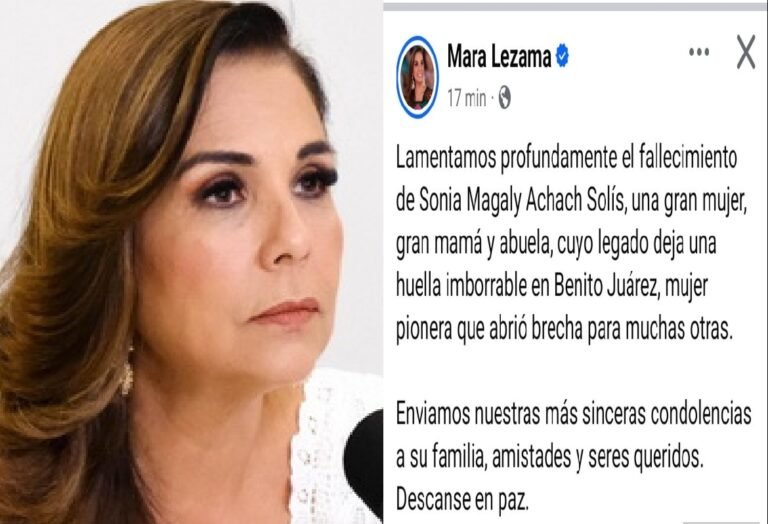Lamentamos profundamente el fallecimiento de Sonia Magaly Achach Solís, una gran mujer, gran mamá y abuela, cuyo legado deja una huella imborrable en Benito Juárez”, publicó la mandataria estatal en un mensaje difundido en redes sociales.