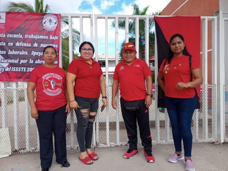 Los maestros de las escuelas de educación preescolar, primarias y secundarias apoyaron el movimiento nacional con banderines de protesta y mantas que a la letra se lee: “En esta escuela trabajamos bajo protesta en defensa de nuestros derechos laborales. Apoyamos la lucha nacional por la abrogación de la Ley del ISSSTE 2007”.