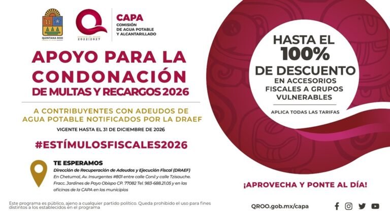 CHETUMAL- El Gobierno del Estado, a través de la Comisión de Agua Potable y Alcantarillado (CAPA), informa que durante todo el año 2026 continuará el programa de condonación de multas, recargos y sanciones para las personas con créditos fiscales, derivados de adeudos mayores a 18 meses en el pago del servicio de agua potable y alcantarillado, que han sido turnados y notificados por la Dirección de Recuperación de Adeudos y Ejecución Fiscal (DRAEF).