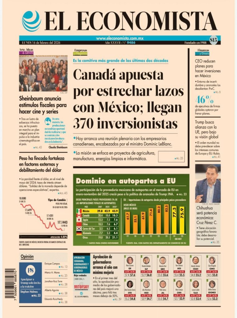 La encuesta fue publicada en la portada nacional de El Economista correspondiente al domingo 16 de febrero de 2026, con 57.6% de respaldo ciudadano.