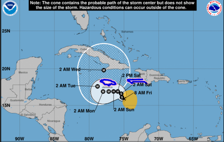 El Centro Nacional de Huracanes (NHC) advirtió que Melissa podría convertirse en huracán el sábado y alcanzar categoría mayor el domingo, a medida que se desplace cerca o al sur de Jamaica a inicios de la próxima semana.