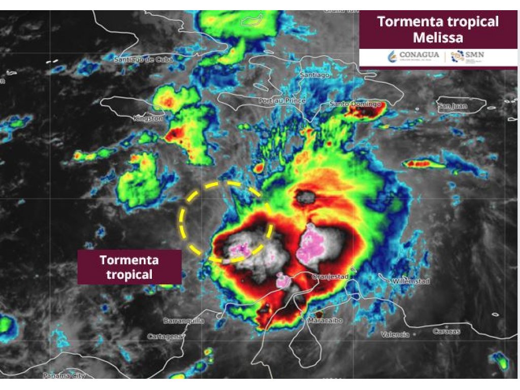 A las 11:00 de la mañana (hora del Este de EE.UU.), el centro de Melissa se localizaba en latitud 15.4 Norte y longitud 74.9 Oeste, aproximadamente a 355 kilómetros al sureste de Kingston, Jamaica, y 450 kilómetros al suroeste de Puerto Príncipe, Haití. Los vientos máximos sostenidos alcanzan los 75 km/h, con ráfagas más fuertes, y se desplaza lentamente hacia el norte-noroeste a 4 km/h. La presión central mínima es de 1003 milibares.
