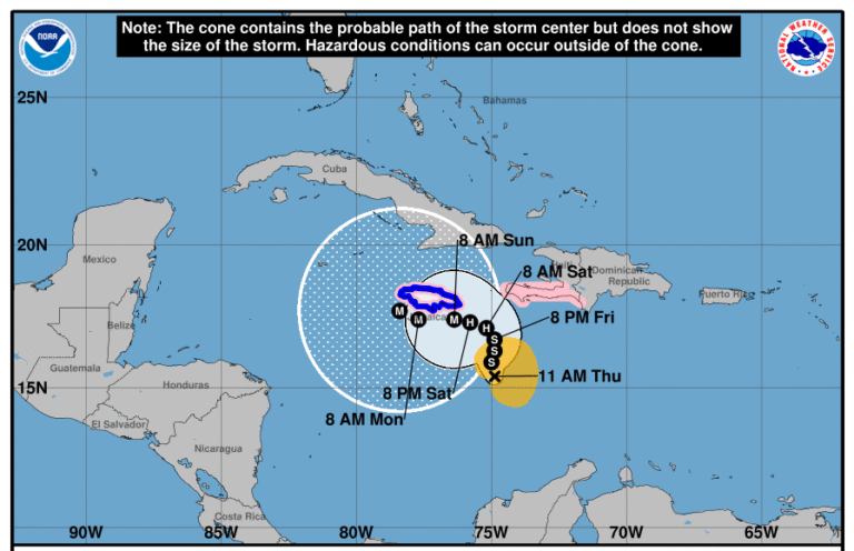 El NHC mantiene alerta de huracán para la península suroeste de Haití (desde la frontera con República Dominicana hasta Puerto Príncipe) y para Jamaica, donde también sigue activa una advertencia de tormenta tropical.