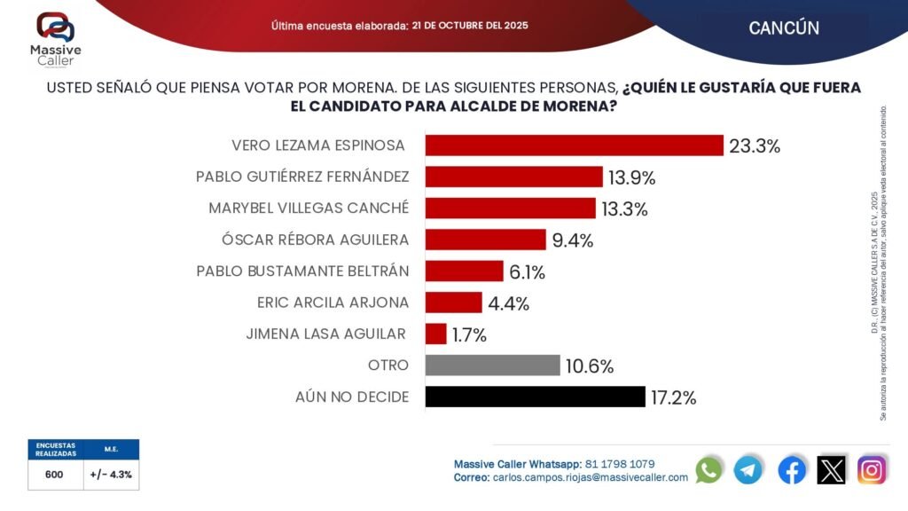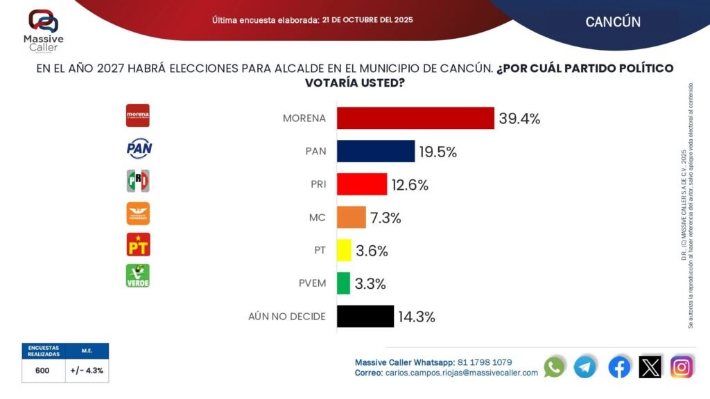 CANCÚN.– Morena encabeza las preferencias rumbo a la elección municipal de 2027 en Cancún, con 39.4 por ciento de intención de voto, de acuerdo con la más reciente encuesta de Massive Caller.