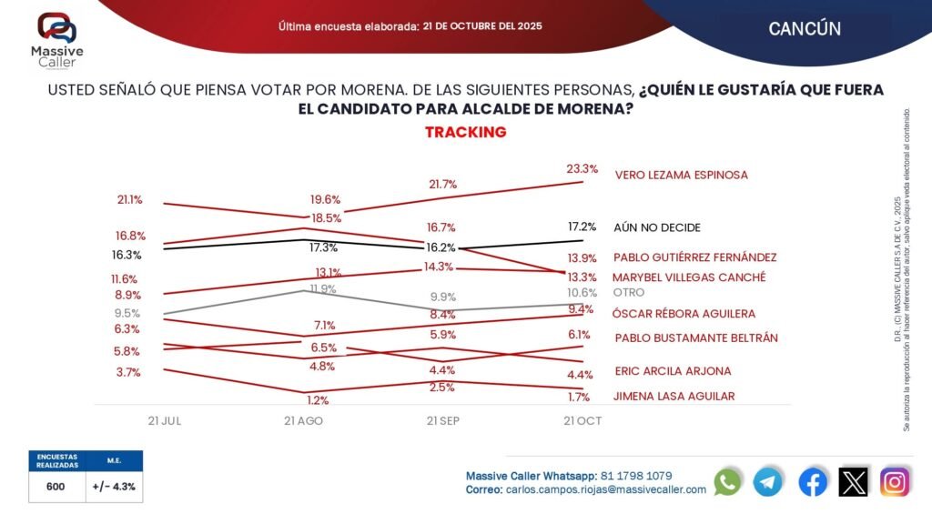 El seguimiento de los últimos tres meses muestra que Vero Lezama Espinosa ha incrementado su posicionamiento de 21.1% en julio a 23.3% en octubre, mientras que los indecisos dentro de Morena bajaron ligeramente de 19.6% a 17.2%.