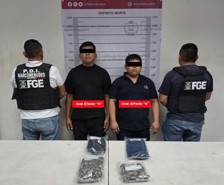 En una primera intervención, elementos de la Policía de Investigación capturaron en la carretera Kantunilkín–Chiquilá, a la altura de la localidad de Kantunilkín, a Manuel Aurelio “N”, Manuel Enrique “N”, Jorge Eduardo “N” y Hannia Michel “N”, a quienes les aseguraron hierba seca con características similares a la marihuana, además de una motocicleta marca Bajaj color negro sin placas de circulación.
