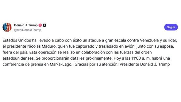 “Estados Unidos ha llevado a cabo con éxito un ataque a gran escala contra Venezuela y su líder, el presidente Nicolás Maduro, fue capturado y trasladado en avión junto con su esposa, fuera del país”, escribió en un mensaje en su red Truth Social.