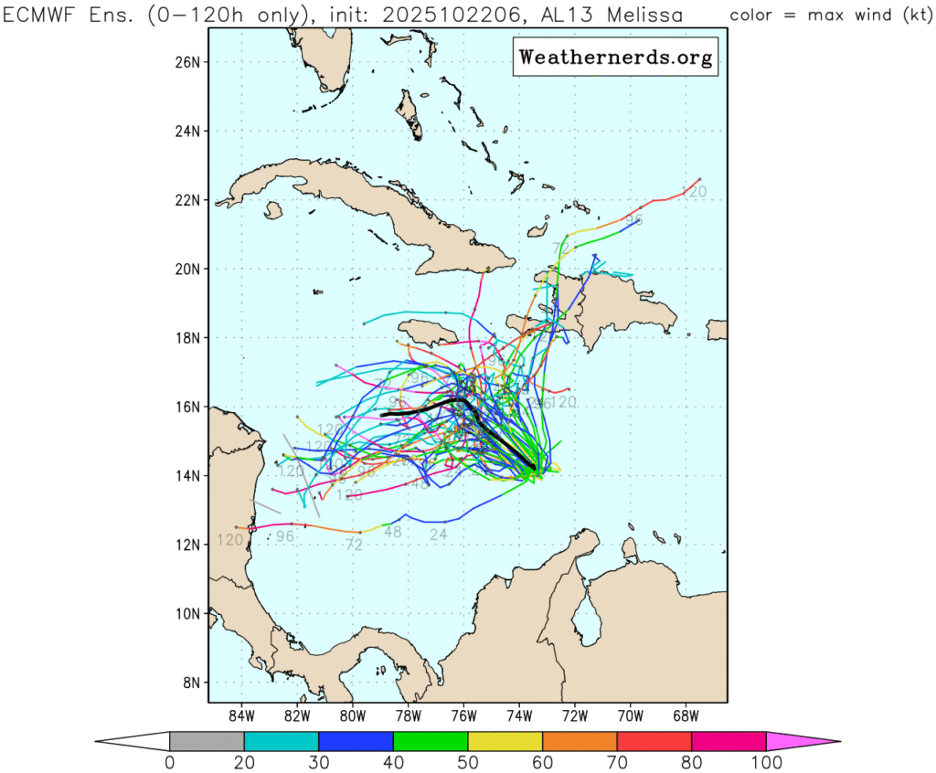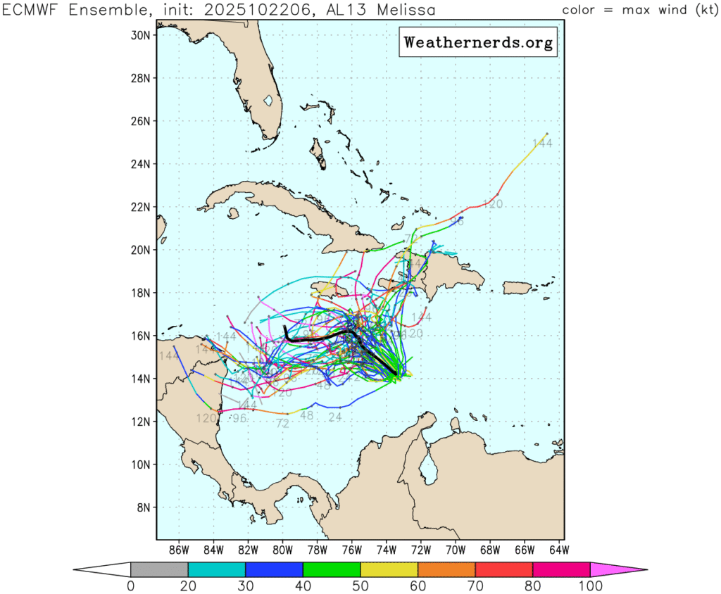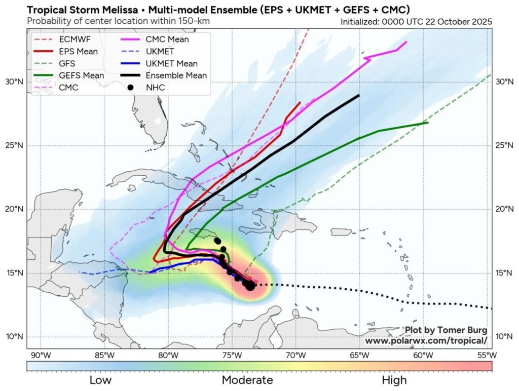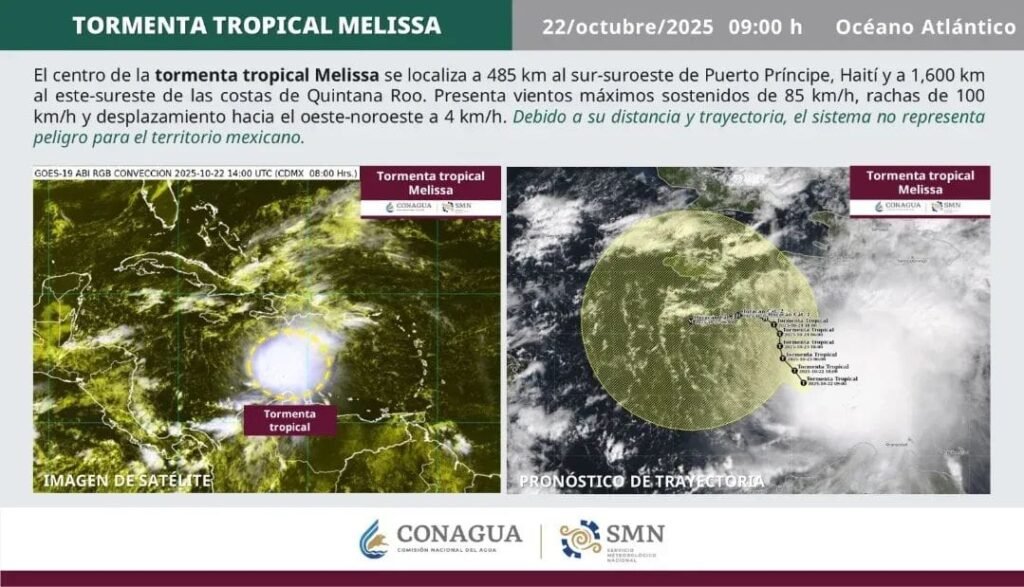 El pronóstico indica que Melissa continuará con un desplazamiento lento hacia el noroeste y norte-noroeste durante los próximos días, con una posible recurvatura hacia el oeste hacia el fin de semana. En esa trayectoria, el sistema podría acercarse a Jamaica y al suroeste de Haití entre jueves y viernes, mientras gana intensidad y podría convertirse en huracán para el viernes.