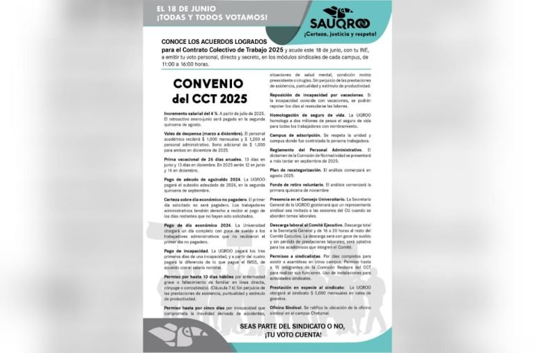 Este miércoles 18 de junio, el Sauqroo someterá a votación abierta y secreta en todos los campus, de 11 a 16 horas, si están de acuerdo o en contra, en la que podrán votar personal sindicalizado o no sindicalizado.