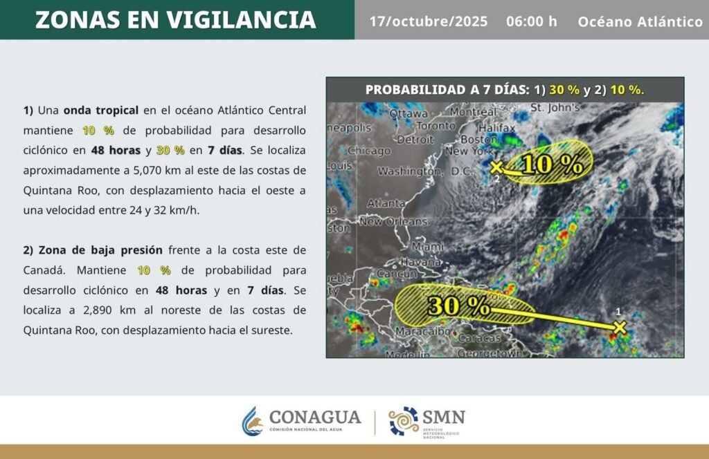 El NHC estimó una probabilidad baja de desarrollo ciclónico, con 10 por ciento en 48 horas y 30 por ciento en siete días, sin representar por ahora una amenaza inmediata para el Caribe mexicano.