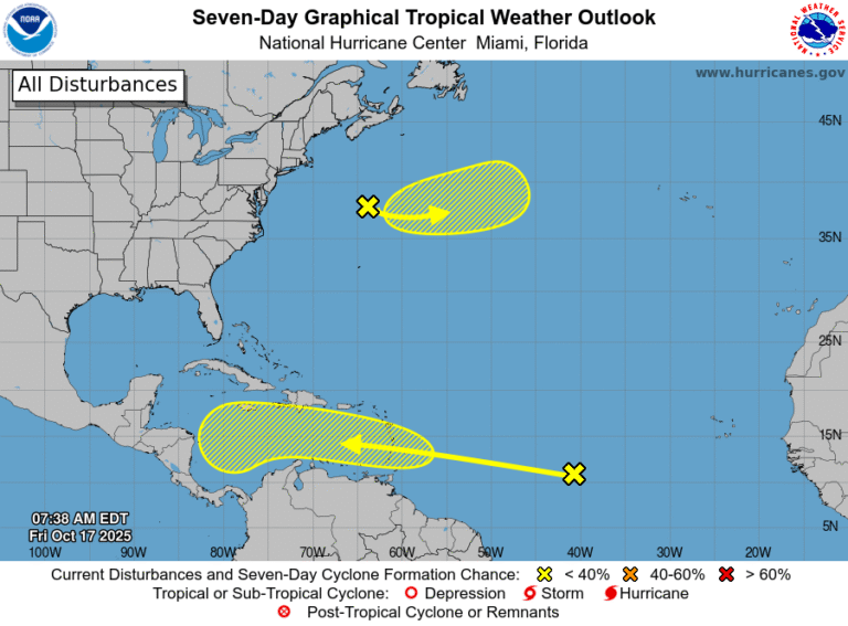 El sistema se desplaza hacia el oeste a una velocidad de 15 a 20 millas por hora y, de acuerdo con el pronóstico, podría acercarse al Mar Caribe a mediados de la próxima semana, generando fuertes lluvias y ráfagas de viento en su paso por las Islas de Barlovento durante el fin de semana.
