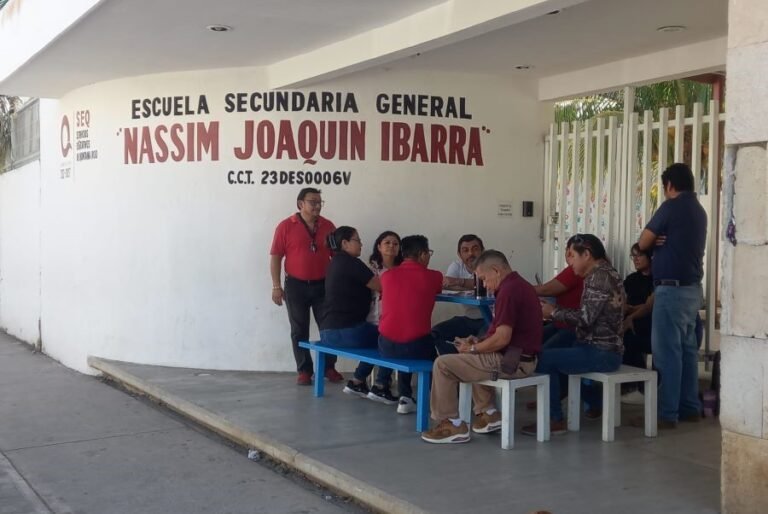 CANCÚN.- Docentes de la Escuela Secundaria General “Nassim Joaquín Ibarra” se encuentran en paro laboral para apoyar a 15 maestros que trabajan por honorarios que no han recibido el pago de las últimas seis quincenas.