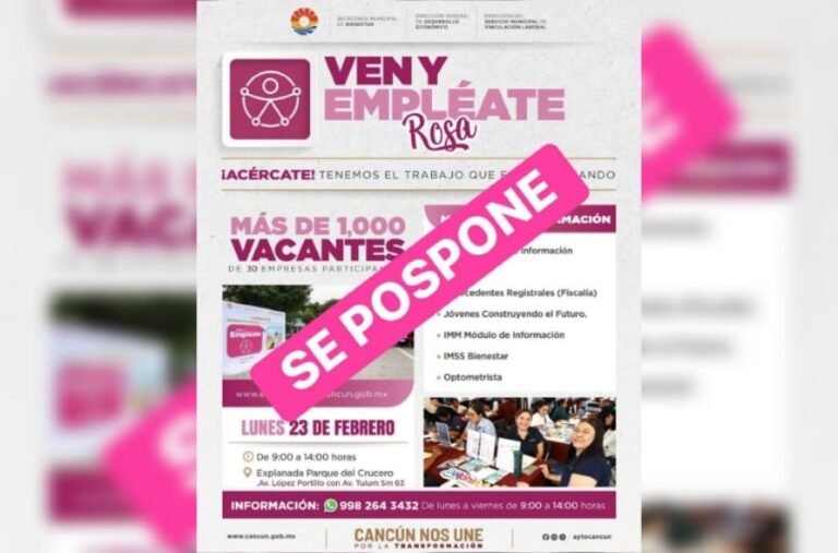 CANCÚN.- El Ayuntamiento de Benito Juárez pospuso la feria “Ven y Empléate Rosa” que estaba programada para realizarse hoy en el Parque de El Crucero ubicado en el centro de Cancún.