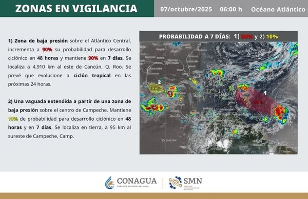 Independientemente de su evolución, el organismo advirtió que es probable la presencia de lluvias intensas y vientos racheados en diversas zonas de la Península de Yucatán, así como en Belice y el sur de México durante los próximos días.