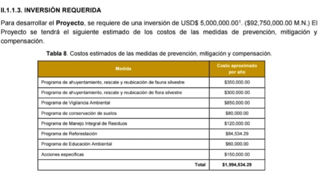 De acuerdo con el promovente, la inversión proyectada para el desarrollo del proyecto asciende a aproximadamente 5 millones de dólares, destinados a la infraestructura hotelera, equipamiento, obras complementarias y la implementación de sistemas sustentables.