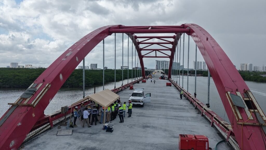 El puente, de 8.8 kilómetros (con tres carriles, uno de ellos reversible); dos entronques, de 2.4 km (uno del lado del Bulevar Luis Donaldo Colosio y otro en el Bulevar Kukulcán), así como un puente en arco metálico, de 103 metros y ciclovías, mejorará la conectividad, dará seguridad y generará empleos directos. Cuando esté concluido se prevé un tránsito diario promedio anual de 12 mil 612 vehículos. El puente beneficiará a 1.3 millones de habitantes y a 20 millones de turistas que anualmente visitan la zona. La constructora ultima detalles para poder cumplir con la entrega a fines de este mes.