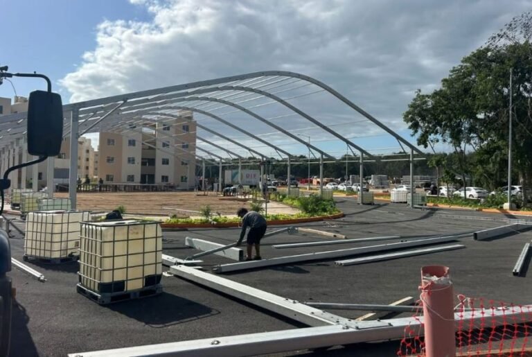 En Playa del Carmen, con maquinaria y cuadrillas de trabajadores, avanza a marchas forzadas la construcción del escenario principal en la que se hará entrega de las llamadas “Viviendas del Bienestar”.