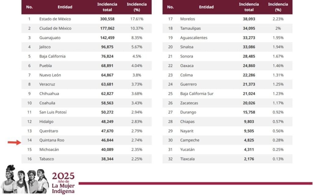 En esta clasificación, Quintana Roo aparece en el lugar 14 con 46 mil 844 registros, equivalente al 2.74 % del total nacional, pero, aun así sigue siendo el estado más violento de la Península de Yucatán.