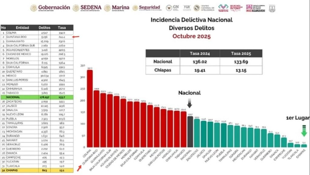 CANCÚN. – Quintana Roo vuelve a posicionarse entre las entidades con niveles más altos de afectación por el crimen en el país. De acuerdo con los reportes de incidencia delictiva de octubre de 2025 elaborados por el Secretariado Ejecutivo del Sistema Nacional de Seguridad Pública (SESNSP), el estado ocupa el sexto lugar nacional en delitos de alto impacto y el segundo sitio en la suma total de delitos.