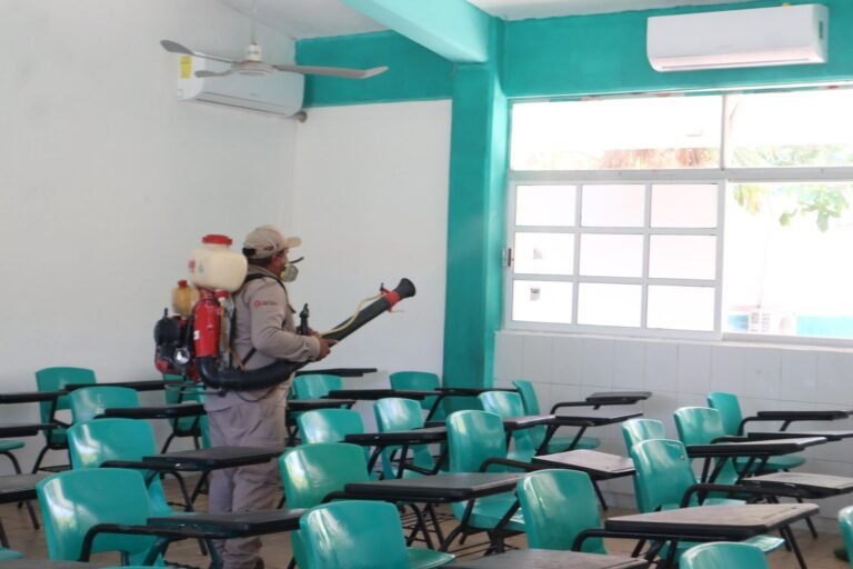 Como parte de estas acciones, hoy se llevaron a cabo labores en la Escuela Secundaria Técnica Número 1 “Benito Juárez” y en el Colegio de Bachilleres Plantel Isla Mujeres, donde personal capacitado realizó la aplicación de termonebulización en áreas estratégicas; mañana serán atendidas las primarias “Julio Sauri” y “Andrés Quintana Roo”.