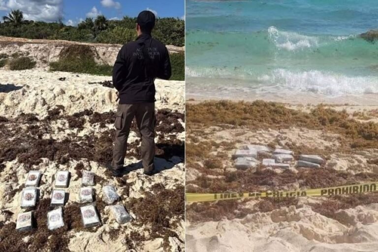 La recuperación se realizó a unos 700 metros al sur de Playacar, en dirección al Parque Xcaret, un corredor de alta afluencia turística. Tras ampliar la inspección, los elementos localizaron más paquetes flotando y aseguraron 11 “tabiques” de aproximadamente un kilo cada uno, algunos con la leyenda “2025”.