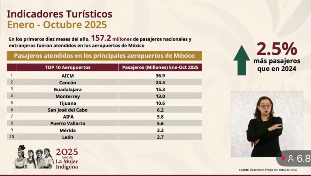 Al mostrar una de las láminas del informe, señaló que el Aeropuerto de Cancún atendió 24.4 millones de pasajeros nacionales y extranjeros entre enero y octubre de 2025, ubicándose como el segundo aeropuerto del país en volumen de operación.